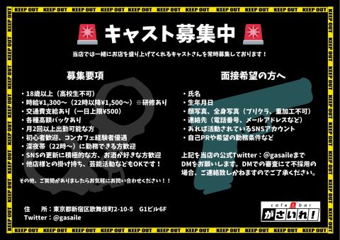| 勤務時間 | 平日 18:00〜23:30/土日祝 17:00〜23:30/深夜 23:00〜05:00 |