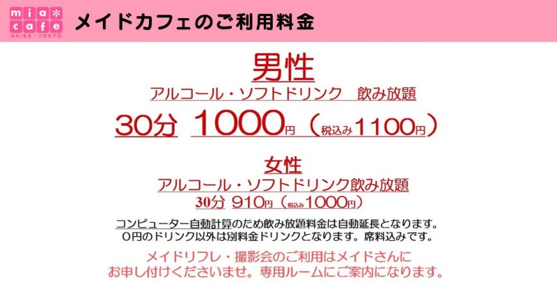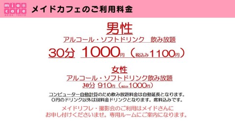 | 営業時間 | 12:00〜22:00(最終受付21:20) 定休日 不定休 深夜営業については、公式ページ右上の深夜営業日案内を ご覧ください(金曜・土曜日を中心に深夜営業予定)。 深夜営業対象日 22:00〜翌朝5:00(最終受付 翌朝4:20) http://market.chu.jp/schedule1/sche37.cgi ミアグループ総合スケジュール(PC&スマホ) http://market.chu.jp/schedule1/sche37.cgi?dm=1 ミアグループ総合スケジュール(ガラケー) 告知日のみ営業となります。告知日以外は深夜営業いたしておりません。 | ||||||||||||||