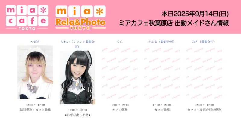 | 営業時間 | 12:00〜22:00(最終受付21:20) 定休日 不定休 深夜営業については、公式ページ右上の深夜営業日案内を ご覧ください(金曜・土曜日を中心に深夜営業予定)。 深夜営業対象日 22:00〜翌朝5:00(最終受付 翌朝4:20) http://market.chu.jp/schedule1/sche37.cgi ミアグループ総合スケジュール(PC&スマホ) http://market.chu.jp/schedule1/sche37.cgi?dm=1 ミアグループ総合スケジュール(ガラケー) 告知日のみ営業となります。告知日以外は深夜営業いたしておりません。 | ||||||||||||||