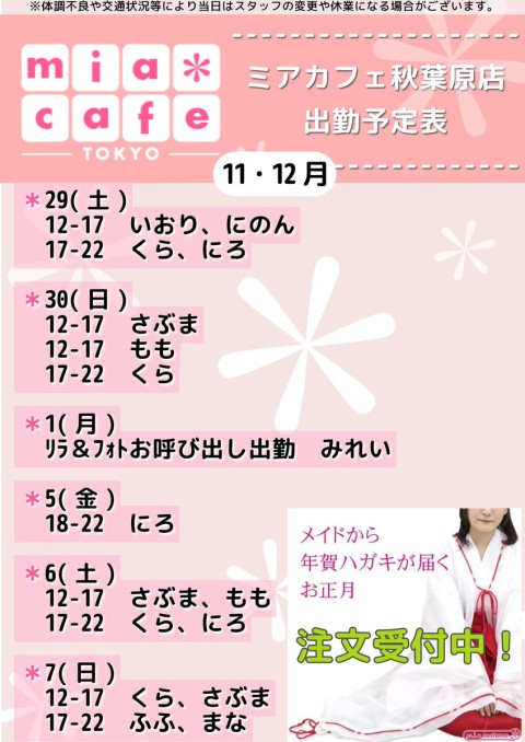 🎍メイドから #年賀状 https://t.co/CjIVfjbH2f ★メイドカフェ ・ミアカフェ秋葉原店★ ☕️営業予定日☕️ 🎀12月5日(金)  18-22 にろ 🎀12月6日(土)  12-17 さぶま,もも  17-22 くら,にろ 🎀12月7日(日)  12-17 くら,さぶま  17-22 ふふ,まな 🎀12月12日(金) リラ&フォト さぶま,みれい https://t.co/C4TZlJ94cO