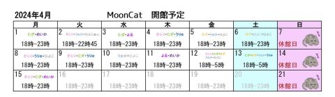 | å¶æ¥æé | å¶æ¥æé å¹³æ¥ãæãæšã20ïŒ00ãæ·±å€2ïŒ00 ããŒãã»ããªã³ã¯ã»ã«ã©ãªã± ã©ã¹ããªãŒããŒïŒ1ïŒ30 鱿«ã»éåã»ç¥åæ¥ã20ïŒ00ãæ·±å€5ïŒ00 ããŒãã»ããªã³ã¯ã»ã«ã©ãªã± ã©ã¹ããªãŒããŒïŒ4ïŒ30 å®äŒæ¥ æ¥ææ¥ â»ãã®ä»ã®èšæåºäŒæ¥ã¯ãtwitterã»HPã«ãŠãæ¡å ããŠãããŸãã ã·ã¹ãã MoonCatäžæŽ²åºã¯ã¿ã€ã ãã£ãŒãžå¶ã§ãã ïŒãäž»äººæ§ ã»æåã®60åãã900å ã»ä»¥é30忝ãã600å ïŒãå¬¢æ§ ããã£ãŒãžæç¡æ ã»ãäžäººæ§ã«ã€ãæåã«ã¯ã³ãªãŒããŒãããã ããŠãããŸãã ãæ³šæãã䌺ãããŠããã®æéå¶ãšãªããŸãã ã»ïŒïŒæ³æªæºã®æ¹ã¯ã22æä»¥éã®ãæ¥åºã¯åºæ¥ãŸããã ã»é転è ã®æ¹ã¯ã飲é ããé æ ®ããã ããŠãããŸãã | ||||||||||||||