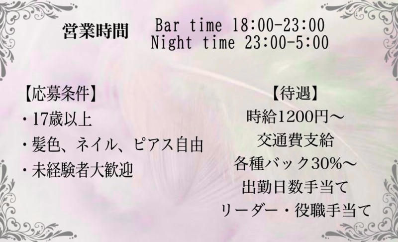 | 営業時間 | バータイム (平日) 18:00〜23:30 ナイトタイム(金・土・祝前) 23:30〜5:00 定休日毎月15日 イベント会場にて主催の場合休業する場合がございます。 | ||||||||||||||