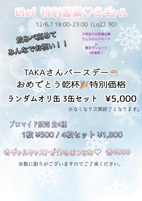 12/6(土) 〜本日のElef〜 Bar time OPEN18:00 CLOSE 23:00(Lo22:30) もも@_momelody めい@ME1_chaaan れん@_renchama ちぴ@CHIPIHIME_ あんり@xr_l0chu 皆様のご来店 心よりお待ちしてます! 近日イベント予定 12/6,7 特別営業♡冬ギャル 12/21 ももめろ生誕 eve https://t.co/Qd4dBUiOpR