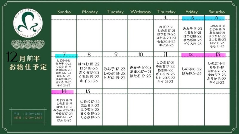 | 営業時間 | 平日:15時〜22時(LO20時30分) 金土日祝:12時〜23時30分(LO23時) 定休日:第1・3水曜日 | ||||||||||||||