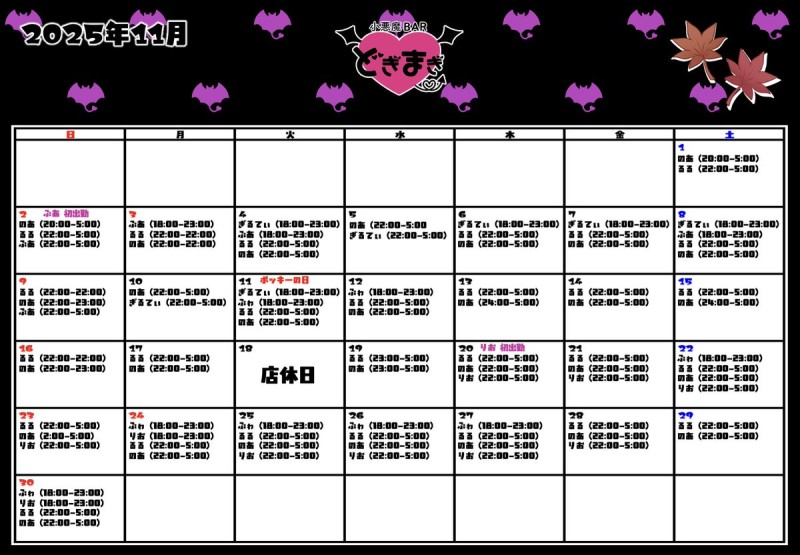 | 営業時間 | 18:00-5:00 | ||||||||||||||