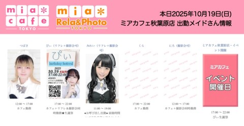 | å¶æ¥æé | âãã¢ã«ãã§æ±äº¬åºïŒã¡ã€ãã«ãã§ïŒhttp://www.mia-cafe.com/ãâ â¡å¹³æ¥ãæïœéãïŒïŒïŒïŒïŒïœïŒïŒïŒïŒïŒ â¡åæã»æ¥æã»ç¥æ¥ãïŒïŒïŒïŒïŒïœïŒïŒïŒïŒïŒ â å®äŒæ¥ããªãïŒ2019幎1æããå®äŒæ¥å»æ¢ïŒ â¡ã©ã¹ããªãŒããŒãéåºã®ïŒïŒåå ãïŒïŒïŒïŒïŒéåºã®å ŽåâïŒïŒïŒïŒïŒã©ã¹ããªãŒããŒ å¶æ¥æ¥ãåºå€ç¶æ³ã«ã€ããŠã¯ãã¡ãã http://pandaland.cutegirl.jp/mif/c_cms_csv/sch_top.php âãã¢ãªã©ïŒãã©ãæ±äº¬åºïŒæ®åœ±äŒïŒãªãã¬ïŒhttp://www.mif-lr.com/ãâ â¡å šæ¥ãïŒïŒïŒïŒïŒãïŒïŒïŒïŒïŒãã§ãããªã©ã¯ãŒãŒã·ã§ã³åºå€ã¹ã¿ãããããæé垯ã®ã¿å¶æ¥ã§ãã â å®äŒæ¥ã¯äžå®äŒïŒåºå€ã¹ã¿ãããããæé垯ã®å¶æ¥ïŒ â¡æçµåä»ãéåºã®ïŒïŒåå ãïŒïŒïŒïŒïŒéåºã®å ŽåâïŒïŒïŒïŒïŒïŒïŒïŒïŒïŒïŒè¿ã«æœè¡æéãçµããã³ãŒã¹ïŒ â»é«æ ¡çäžå¯ âæ·±å€å¶æ¥ã«ã€ããŠã¯ãå ¬åŒãµã€ãå³äžã® http://market.chu.jp/schedule1/sche37.cgi ãã¢ã°ã«ãŒãç·åã¹ã±ãžã¥ãŒã«ïŒïŒ°ïŒ£ã»ã¹ããïŒ http://market.chu.jp/schedule1/sche37.cgi?dm=1 ãã¢ã°ã«ãŒãç·åã¹ã±ãžã¥ãŒã«ïŒã¬ã©æºåž¯ïŒ ãã芧ãã ãããåç¥æ¥ã®ã¿å¶æ¥ãšãªããŸããåç¥æ¥ä»¥å€ã¯æ·±å€å¶æ¥ããããŠãããŸããã æ·±å€å¶æ¥å¯Ÿè±¡æ¥ãïŒïŒïŒïŒïŒãç¿æïŒïŒïŒïŒïŒïŒ¬ïŒïŒ¯ïŒïŒïŒïŒïŒïŒ | ||||||||||||||