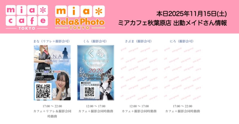 | å¶æ¥æé | âãã¢ã«ãã§æ±äº¬åºïŒã¡ã€ãã«ãã§ïŒhttp://www.mia-cafe.com/ãâ â¡å¹³æ¥ãæïœéãïŒïŒïŒïŒïŒïœïŒïŒïŒïŒïŒ â¡åæã»æ¥æã»ç¥æ¥ãïŒïŒïŒïŒïŒïœïŒïŒïŒïŒïŒ â å®äŒæ¥ããªãïŒ2019幎1æããå®äŒæ¥å»æ¢ïŒ â¡ã©ã¹ããªãŒããŒãéåºã®ïŒïŒåå ãïŒïŒïŒïŒïŒéåºã®å ŽåâïŒïŒïŒïŒïŒã©ã¹ããªãŒããŒ å¶æ¥æ¥ãåºå€ç¶æ³ã«ã€ããŠã¯ãã¡ãã http://pandaland.cutegirl.jp/mif/c_cms_csv/sch_top.php âãã¢ãªã©ïŒãã©ãæ±äº¬åºïŒæ®åœ±äŒïŒãªãã¬ïŒhttp://www.mif-lr.com/ãâ â¡å šæ¥ãïŒïŒïŒïŒïŒãïŒïŒïŒïŒïŒãã§ãããªã©ã¯ãŒãŒã·ã§ã³åºå€ã¹ã¿ãããããæé垯ã®ã¿å¶æ¥ã§ãã â å®äŒæ¥ã¯äžå®äŒïŒåºå€ã¹ã¿ãããããæé垯ã®å¶æ¥ïŒ â¡æçµåä»ãéåºã®ïŒïŒåå ãïŒïŒïŒïŒïŒéåºã®å ŽåâïŒïŒïŒïŒïŒïŒïŒïŒïŒïŒïŒè¿ã«æœè¡æéãçµããã³ãŒã¹ïŒ â»é«æ ¡çäžå¯ âæ·±å€å¶æ¥ã«ã€ããŠã¯ãå ¬åŒãµã€ãå³äžã® http://market.chu.jp/schedule1/sche37.cgi ãã¢ã°ã«ãŒãç·åã¹ã±ãžã¥ãŒã«ïŒïŒ°ïŒ£ã»ã¹ããïŒ http://market.chu.jp/schedule1/sche37.cgi?dm=1 ãã¢ã°ã«ãŒãç·åã¹ã±ãžã¥ãŒã«ïŒã¬ã©æºåž¯ïŒ ãã芧ãã ãããåç¥æ¥ã®ã¿å¶æ¥ãšãªããŸããåç¥æ¥ä»¥å€ã¯æ·±å€å¶æ¥ããããŠãããŸããã æ·±å€å¶æ¥å¯Ÿè±¡æ¥ãïŒïŒïŒïŒïŒãç¿æïŒïŒïŒïŒïŒïŒ¬ïŒïŒ¯ïŒïŒïŒïŒïŒïŒ | ||||||||||||||