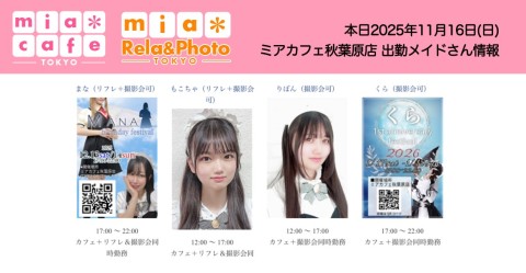 | å¶æ¥æé | âãã¢ã«ãã§æ±äº¬åºïŒã¡ã€ãã«ãã§ïŒhttp://www.mia-cafe.com/ãâ â¡å¹³æ¥ãæïœéãïŒïŒïŒïŒïŒïœïŒïŒïŒïŒïŒ â¡åæã»æ¥æã»ç¥æ¥ãïŒïŒïŒïŒïŒïœïŒïŒïŒïŒïŒ â å®äŒæ¥ããªãïŒ2019幎1æããå®äŒæ¥å»æ¢ïŒ â¡ã©ã¹ããªãŒããŒãéåºã®ïŒïŒåå ãïŒïŒïŒïŒïŒéåºã®å ŽåâïŒïŒïŒïŒïŒã©ã¹ããªãŒããŒ å¶æ¥æ¥ãåºå€ç¶æ³ã«ã€ããŠã¯ãã¡ãã http://pandaland.cutegirl.jp/mif/c_cms_csv/sch_top.php âãã¢ãªã©ïŒãã©ãæ±äº¬åºïŒæ®åœ±äŒïŒãªãã¬ïŒhttp://www.mif-lr.com/ãâ â¡å šæ¥ãïŒïŒïŒïŒïŒãïŒïŒïŒïŒïŒãã§ãããªã©ã¯ãŒãŒã·ã§ã³åºå€ã¹ã¿ãããããæé垯ã®ã¿å¶æ¥ã§ãã â å®äŒæ¥ã¯äžå®äŒïŒåºå€ã¹ã¿ãããããæé垯ã®å¶æ¥ïŒ â¡æçµåä»ãéåºã®ïŒïŒåå ãïŒïŒïŒïŒïŒéåºã®å ŽåâïŒïŒïŒïŒïŒïŒïŒïŒïŒïŒïŒè¿ã«æœè¡æéãçµããã³ãŒã¹ïŒ â»é«æ ¡çäžå¯ âæ·±å€å¶æ¥ã«ã€ããŠã¯ãå ¬åŒãµã€ãå³äžã® http://market.chu.jp/schedule1/sche37.cgi ãã¢ã°ã«ãŒãç·åã¹ã±ãžã¥ãŒã«ïŒïŒ°ïŒ£ã»ã¹ããïŒ http://market.chu.jp/schedule1/sche37.cgi?dm=1 ãã¢ã°ã«ãŒãç·åã¹ã±ãžã¥ãŒã«ïŒã¬ã©æºåž¯ïŒ ãã芧ãã ãããåç¥æ¥ã®ã¿å¶æ¥ãšãªããŸããåç¥æ¥ä»¥å€ã¯æ·±å€å¶æ¥ããããŠãããŸããã æ·±å€å¶æ¥å¯Ÿè±¡æ¥ãïŒïŒïŒïŒïŒãç¿æïŒïŒïŒïŒïŒïŒ¬ïŒïŒ¯ïŒïŒïŒïŒïŒïŒ | ||||||||||||||