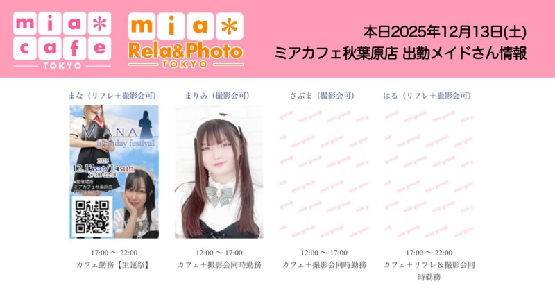 | å¶æ¥æé | âãã¢ã«ãã§æ±äº¬åºïŒã¡ã€ãã«ãã§ïŒhttp://www.mia-cafe.com/ãâ â¡å¹³æ¥ãæïœéãïŒïŒïŒïŒïŒïœïŒïŒïŒïŒïŒ â¡åæã»æ¥æã»ç¥æ¥ãïŒïŒïŒïŒïŒïœïŒïŒïŒïŒïŒ â å®äŒæ¥ããªãïŒ2019幎1æããå®äŒæ¥å»æ¢ïŒ â¡ã©ã¹ããªãŒããŒãéåºã®ïŒïŒåå ãïŒïŒïŒïŒïŒéåºã®å ŽåâïŒïŒïŒïŒïŒã©ã¹ããªãŒããŒ å¶æ¥æ¥ãåºå€ç¶æ³ã«ã€ããŠã¯ãã¡ãã http://pandaland.cutegirl.jp/mif/c_cms_csv/sch_top.php âãã¢ãªã©ïŒãã©ãæ±äº¬åºïŒæ®åœ±äŒïŒãªãã¬ïŒhttp://www.mif-lr.com/ãâ â¡å šæ¥ãïŒïŒïŒïŒïŒãïŒïŒïŒïŒïŒãã§ãããªã©ã¯ãŒãŒã·ã§ã³åºå€ã¹ã¿ãããããæé垯ã®ã¿å¶æ¥ã§ãã â å®äŒæ¥ã¯äžå®äŒïŒåºå€ã¹ã¿ãããããæé垯ã®å¶æ¥ïŒ â¡æçµåä»ãéåºã®ïŒïŒåå ãïŒïŒïŒïŒïŒéåºã®å ŽåâïŒïŒïŒïŒïŒïŒïŒïŒïŒïŒïŒè¿ã«æœè¡æéãçµããã³ãŒã¹ïŒ â»é«æ ¡çäžå¯ âæ·±å€å¶æ¥ã«ã€ããŠã¯ãå ¬åŒãµã€ãå³äžã® http://market.chu.jp/schedule1/sche37.cgi ãã¢ã°ã«ãŒãç·åã¹ã±ãžã¥ãŒã«ïŒïŒ°ïŒ£ã»ã¹ããïŒ http://market.chu.jp/schedule1/sche37.cgi?dm=1 ãã¢ã°ã«ãŒãç·åã¹ã±ãžã¥ãŒã«ïŒã¬ã©æºåž¯ïŒ ãã芧ãã ãããåç¥æ¥ã®ã¿å¶æ¥ãšãªããŸããåç¥æ¥ä»¥å€ã¯æ·±å€å¶æ¥ããããŠãããŸããã æ·±å€å¶æ¥å¯Ÿè±¡æ¥ãïŒïŒïŒïŒïŒãç¿æïŒïŒïŒïŒïŒïŒ¬ïŒïŒ¯ïŒïŒïŒïŒïŒïŒ | ||||||||||||||