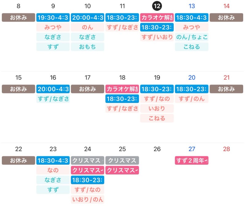 🎀écru12月𝗌𝖼𝗁𝖾𝖽𝗎𝗅e🎀 ◽︎12/12(金)…カラオケ解放デー🎤🎶 以降のスケジュール(予定) ◽︎12/24(水)…クリスマスイベント☃️❄️ ◽︎12/25(木)…クリスマスイベント🎅🏻🎄 ◽︎12/27(土)…すず2周年イベント💎💍 https://t.co/4dRf7tQqS4