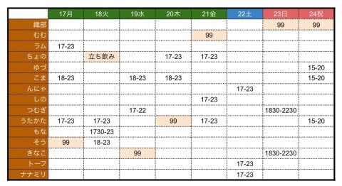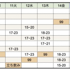 | 営業時間 | 18:00〜 | ||||||||||||||