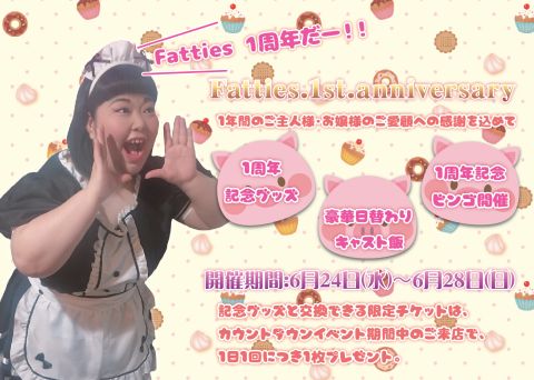 Fatties1周年イベント開催中! 本日は 岩えもんマヨぱんいちごパフェまとん がお待ちしております♪