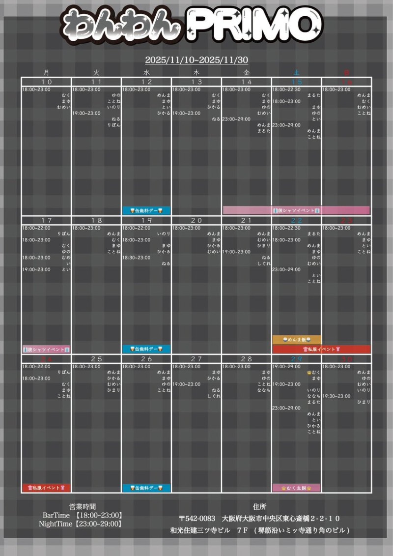 | 営業時間 | 月~日 18~23 金、土 23~29(不定期) | ||||||||||||||