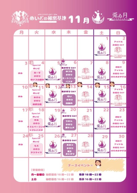 | 営業時間 | *火曜日~金曜日*18:00~23:00 *土曜日、日曜日*16:00~23:00 *月曜日、木曜日*定休日 (イベントなどで営業時間が変わることがあります。) | ||||||||||||||