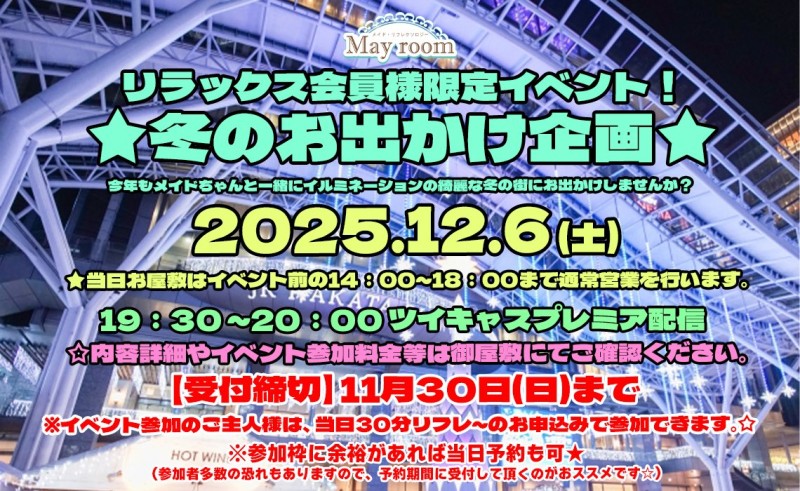 🎄2025幎12月16日31日 営業日メむドお絊仕情報🀶🏻 前日たでの予玄で特兞プレれント🎁 貞切や営業時間倖の予玄をご垌望の堎合はお早めにDM(mayroom_room)指名予玄はTEL(☎092-722-1603) お屋敷ぞお問い合わせください💫 メむドリフレク゜ロゞヌ May room -めいるヌむ- https://t.co/HAucMVgphP https://t.co/yl1bZhGayz