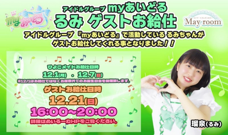 アむドルグルヌプ [myあいどる るみ]ゲストお絊仕🎀🎀 12/1(月)17-21るみ BD䌚~歌姫LIVEプレミア配信~ のの♡めい 12/7(日)15-19るみ🐣 🆕ひよこメむド🐣らん (あいか ※指名予玄のみ) 12/21(日)16-20るみゲストお絊仕 のの メむドリフレク゜ロゞヌ May room -めいるヌむ- https://t.co/LkDADAYqeK https://t.co/zHtVBKKS0H