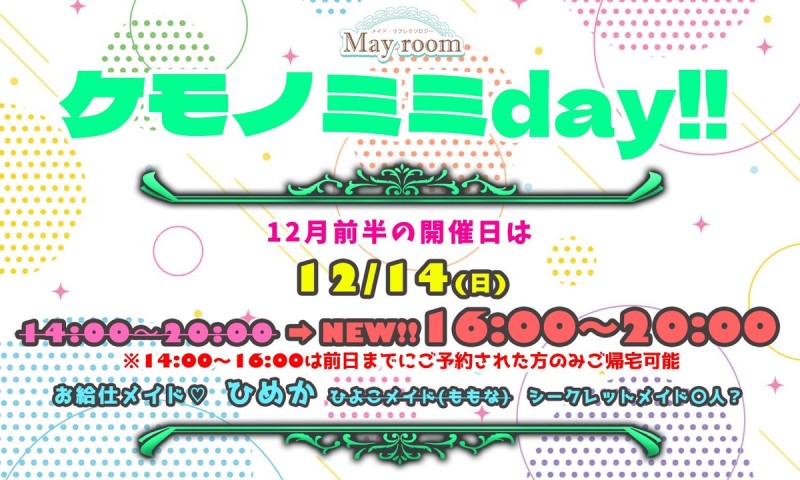 🐰ケモノミミdayのお知らせ🐶 12月前半のケモノミミdayは、14日の日曜日開催です🐈 12月14日日1400〜2000 絊仕メむド♡ひよこメむド(ももな)14-18 ひめか16-20♡シヌクレットメむド〇人 メむドリフレク゜ロゞヌ May room -めいるヌむ- https://t.co/PnueBPE8Rq https://t.co/Mg33NQd7Ee