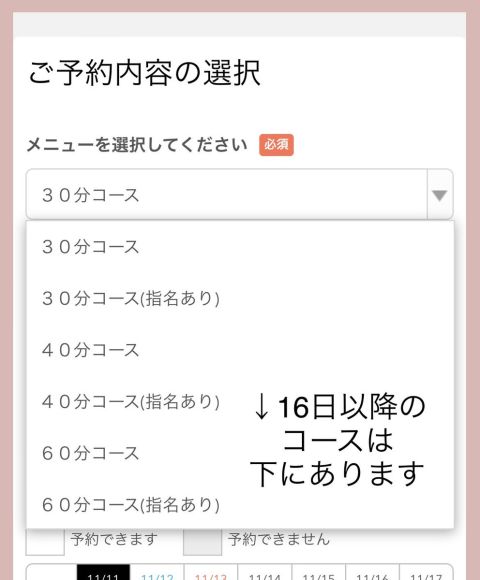 新料金でのコースはメニューを下にスクロールしていただくと出てきますので、そちらを選択してご予約ください。