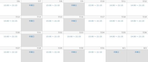 | 営業時間 | 現在営業時間を短縮しております。 平日15:00-21:00 土日14:00-22:00 火・水・木はお休みです。 | ||||||||||||||