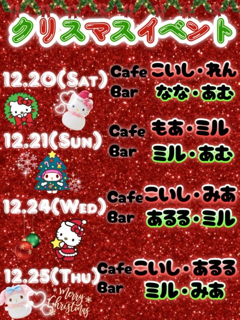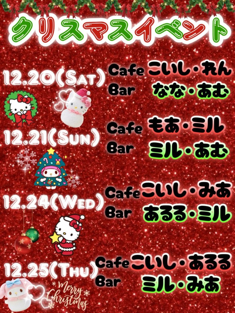 【イベント告知】 ✨🕯️🎄クリスマスイベント🎄🕯️✨ 12月20日(土) C:こいし・れん B:なな・あむ 21日(日) C:もあ・ミル B:ミル・あむ 24日(水) C:こいし・みあ B:あるる・ミル 25日(木) C:こいし・あるる B:ミル・みあ 一緒に素敵なクリスマス過ごしましょう⛄️✨ ご帰宅お待ちしております🎅🏼♥️ https://t.co/mjxRqJuXX0