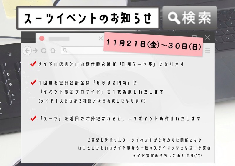 本日もご帰宅ありがとうございました💗 次の営業日時は 【11月25日】【14:00~21:00】 お留守番予定メイドは 🖤まりあ 🤍こおり でございます🎵 30日まで💻スーツイベント💻が開催中です✨ スーツ姿で皆様のご帰宅をお待ちしております☺️💓 https://t.co/gFwoYfTTJY
