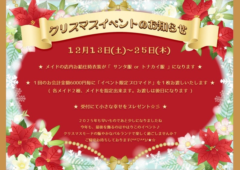 こんにちは♬ 本日の営業日時は 【12月13日】【12:00〜22:00】 お留守番予定メイドは 🔔まりあ 🔔こおり(15〜21) 🔔りりな(〜18:30) 🔔つばめ(16〜21) でございます🎵 本日より25日まで🎄クリスマスイベント🎄が開催です🎊✨ サンタ🤶orトナカイ🦌姿でご帰宅お待ちしております☺️❤️ https://t.co/tOB4uFIf2e