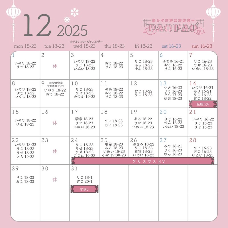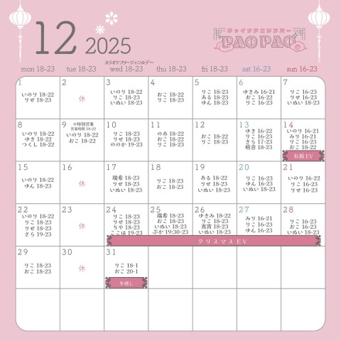 🐼12月の予定🐼 🎤毎週水曜日カラオケフリージャンルデー 【イベント】 14日私服EV 24~28日クリスマスEV🎄 31日年越し🎍 ※詳細は画像をご覧ください ⚠️店休日:毎週火曜 ✨キャスト募集中✨🔽詳細 🎀姉妹店🎀 @melfi_maid 予定変更やイベント詳細はスレッドにて🔽 https://t.co/oQek7UvlHY