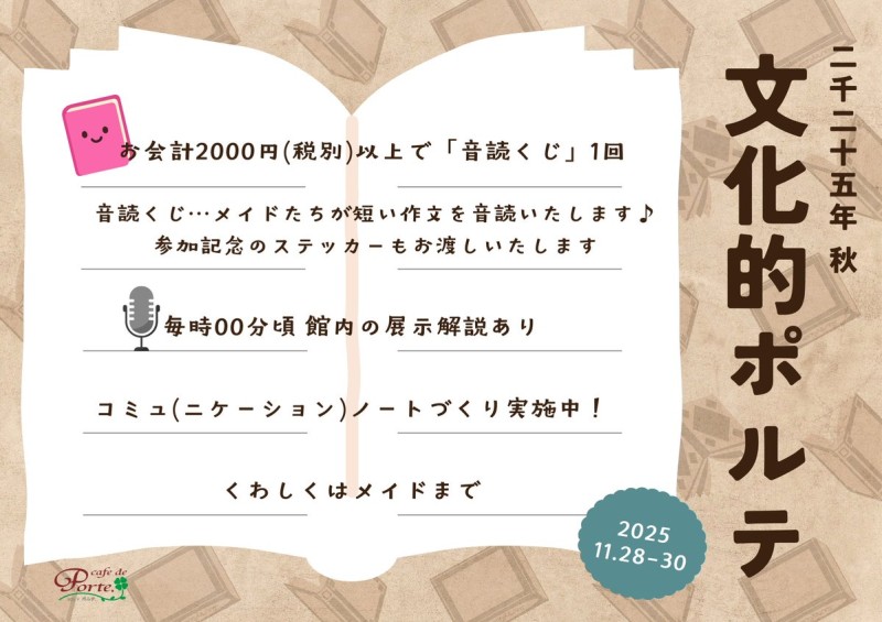 ご䞻人様・お嬢様 ごきげんよう☕ 開通しおおりたす 11月28日(金) 【 OPEN 16:30CLOSE 22:00 】 LO FOOD 21:00 DRINKDESSERT 21:30 本日より3日間は『 文化的ポルテ 』の締めくくり📚 通内展瀺の解説や音読くじがございたす🖌 お垰りを心よりお埅ちしおおりたす🏡 https://t.co/MhzqJ3iid7