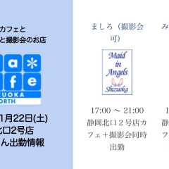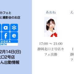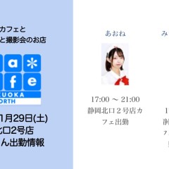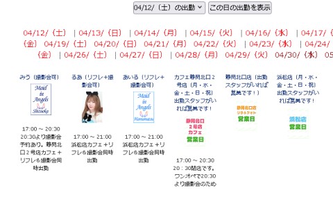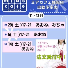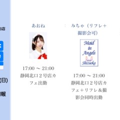 | 営業時間 | 静岡店は出勤スタッフがいれば営業です! 基本的に 12時~22時が営業時間です! ●静岡店のツイッター @shizuokamaidsan https://twitter.com/shizuokamaidsan ●ミア静岡店の営業曜日&営業時間● ☆月〜木 14:00〜22:00(最終受付20:00) ☆金曜日 12:00〜22:00(最終受付21:00) ☆土・日・祝 12:00〜22:00(最終受付21:00) 営業時間外はオンライン予約にてお願いいたします。 PC・携帯共通 → http://m-kanzume.moo.jp/yoyaku2/user.cgi ●ミアガイド出勤状況● スマホ・PC → 後日公開予定 ★静岡店スタッフによるミア甲府店でのメイドカフェリアル営業★ ☆不定期 サイトにてご確認ください。 http://market.chu.jp/schedule1/sche37.cgi | ||||||||||||||