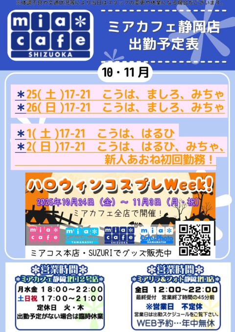🎃11月2日(日) 17-21 こうは・はるひ・みちゃ・🔰あおね初勤務 https://t.co/XPhHr0YsPz