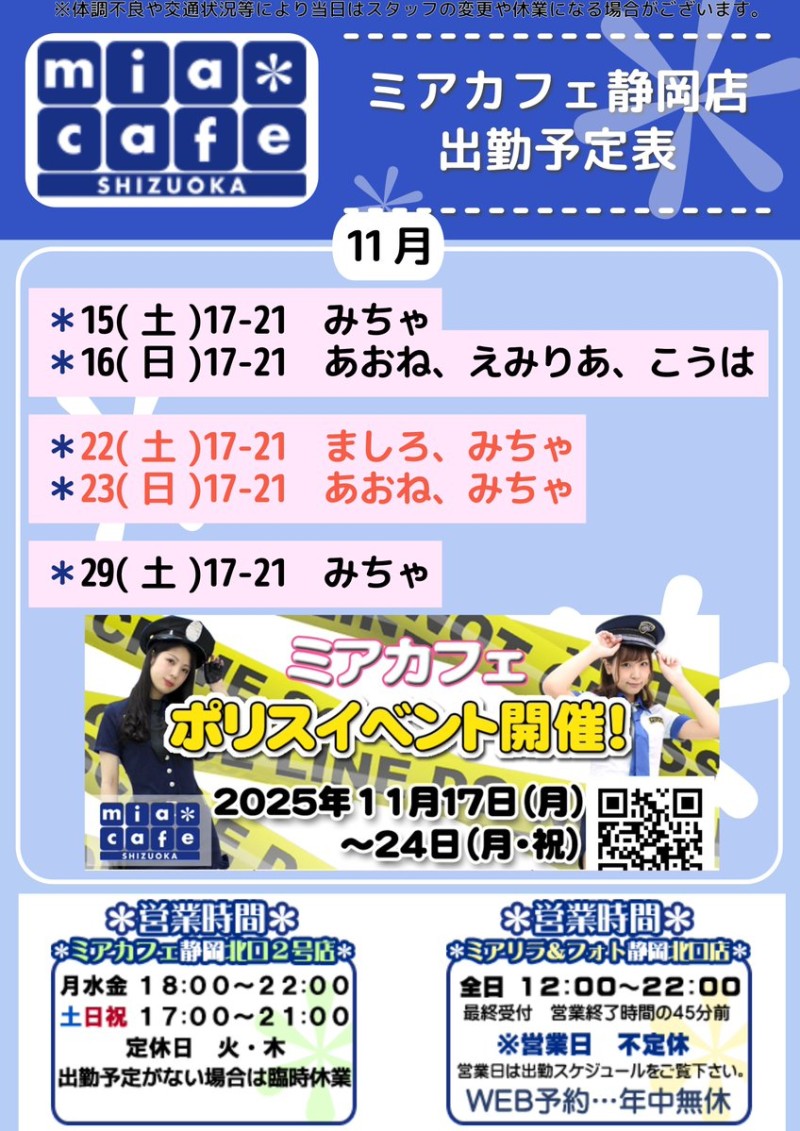 ★#メイドカフェ ・ #ミアカフェ #静岡 北口2号店★ ☕️営業予定日☕️ 💖11月15日(土) 17-21 みちゃ 💖11月16日(日) 17-21 あおね・えみりあ・こうは 🚨ポリスイベント🚨 🚨11月22日(土) 17-21 ましろ・みちゃ 🚨11月23日(日) 17-21 あおね・みちゃ 💖11月29日(土) 17-21 みちゃ #コンカフェ https://t.co/8YrP0R97Yy