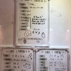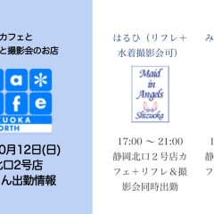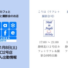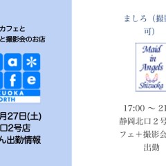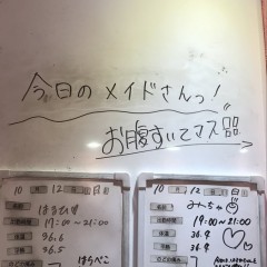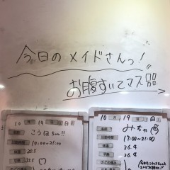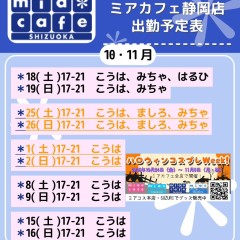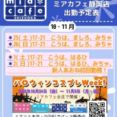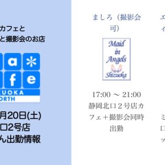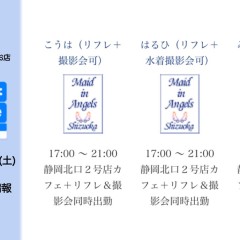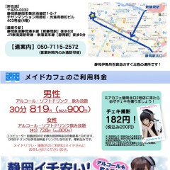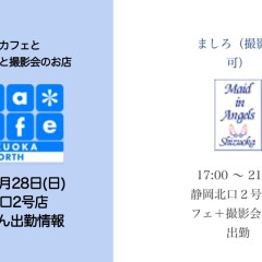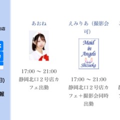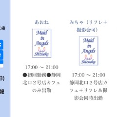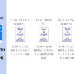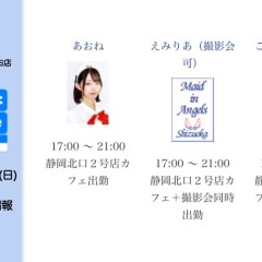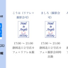 | 営業時間 | 静岡店は出勤スタッフがいれば営業です! 基本的に 12時~22時が営業時間です! ●静岡店のツイッター @shizuokamaidsan https://twitter.com/shizuokamaidsan ●ミア静岡店の営業曜日&営業時間● ☆月〜木 14:00〜22:00(最終受付20:00) ☆金曜日 12:00〜22:00(最終受付21:00) ☆土・日・祝 12:00〜22:00(最終受付21:00) 営業時間外はオンライン予約にてお願いいたします。 PC・携帯共通 → http://m-kanzume.moo.jp/yoyaku2/user.cgi ●ミアガイド出勤状況● スマホ・PC → 後日公開予定 ★静岡店スタッフによるミア甲府店でのメイドカフェリアル営業★ ☆不定期 サイトにてご確認ください。 http://market.chu.jp/schedule1/sche37.cgi | ||||||||||||||