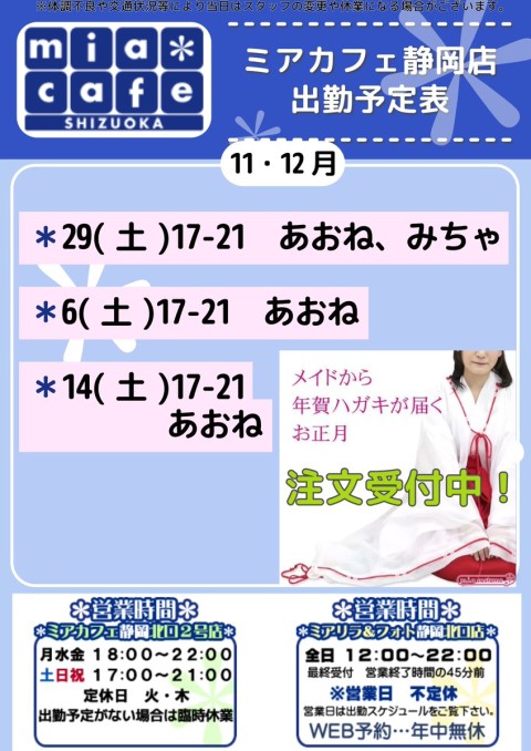 | 営業時間 | 静岡店は出勤スタッフがいれば営業です! 基本的に 12時~22時が営業時間です! ●静岡店のツイッター @shizuokamaidsan https://twitter.com/shizuokamaidsan ●ミア静岡店の営業曜日&営業時間● ☆月〜木 14:00〜22:00(最終受付20:00) ☆金曜日 12:00〜22:00(最終受付21:00) ☆土・日・祝 12:00〜22:00(最終受付21:00) 営業時間外はオンライン予約にてお願いいたします。 PC・携帯共通 → http://m-kanzume.moo.jp/yoyaku2/user.cgi ●ミアガイド出勤状況● スマホ・PC → 後日公開予定 ★静岡店スタッフによるミア甲府店でのメイドカフェリアル営業★ ☆不定期 サイトにてご確認ください。 http://market.chu.jp/schedule1/sche37.cgi | ||||||||||||||